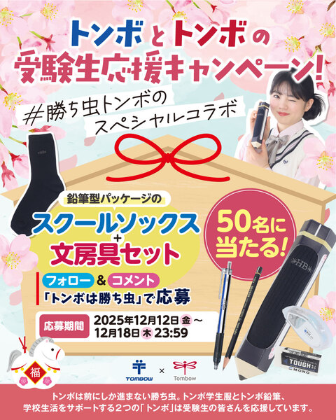 2025年12月12日 【キャンペーン】株式会社トンボ鉛筆とのスペシャルコラボ「受験生応援キャンペーン」開催中 この度、学生を応援し同じ【トンボ】の名をもつ「株式会社トンボ」と「株式会社トンボ鉛筆」の2社は受験生を応援するため、インスタグラムでスペシャルコラボキャンペーンを開催中です。 勝ち虫トンボのスペシャルコラボ【受験生応援キャンペーン】 応募期間:2025年12月12日(金)〜12月18日(木)23:59 詳しくはキャンペーン投稿をご覧ください。 前へ 1 2 3 4 5 6 7 8 9 次へ